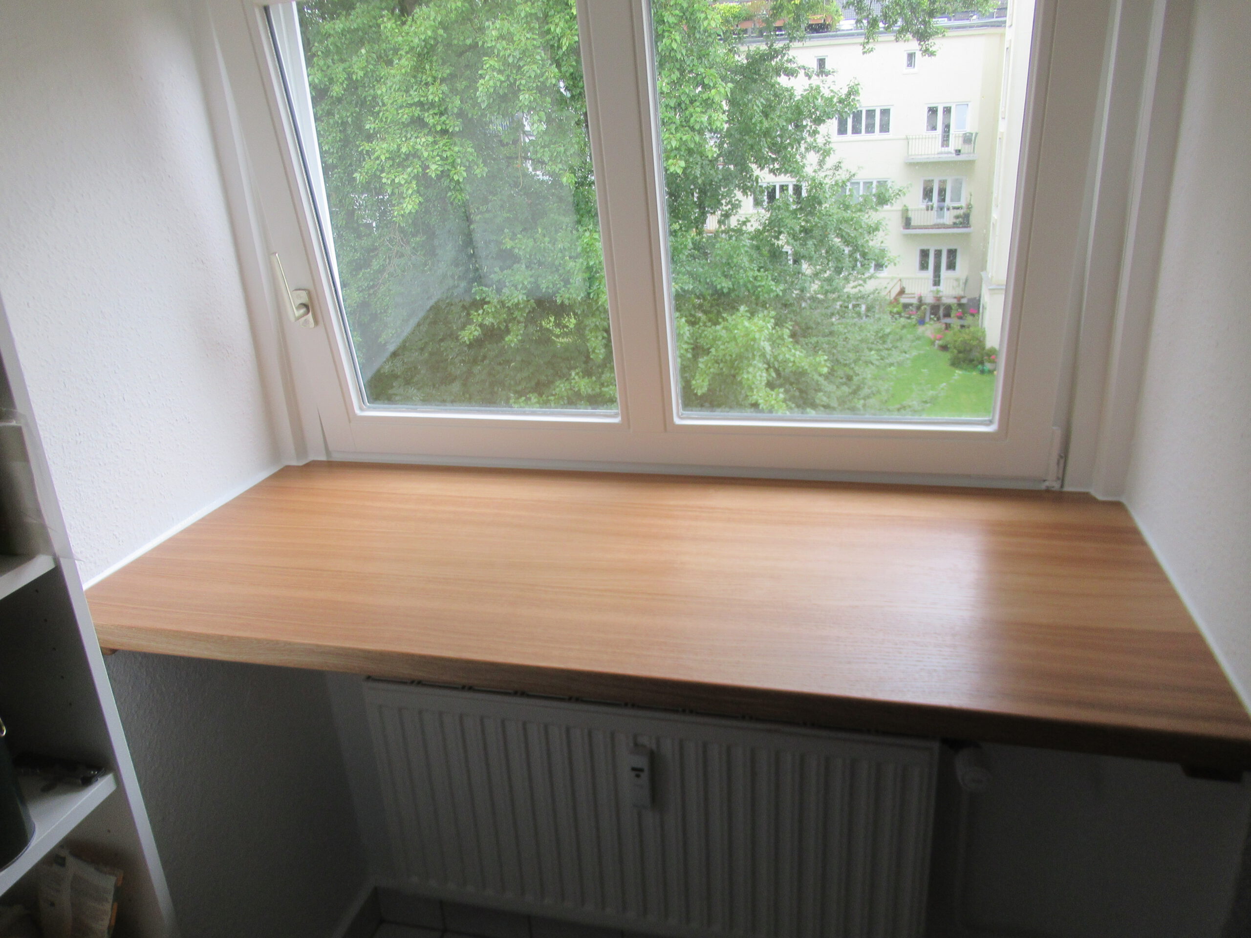 Sie wollte zwei neue Fensterbänke aus Eiche, die nicht nur hübsch aussehen, sondern auch praktisch genutzt werden können – als kleine Tresenfläche im Wohnzimmer und als Arbeitsfläche in der Küche.