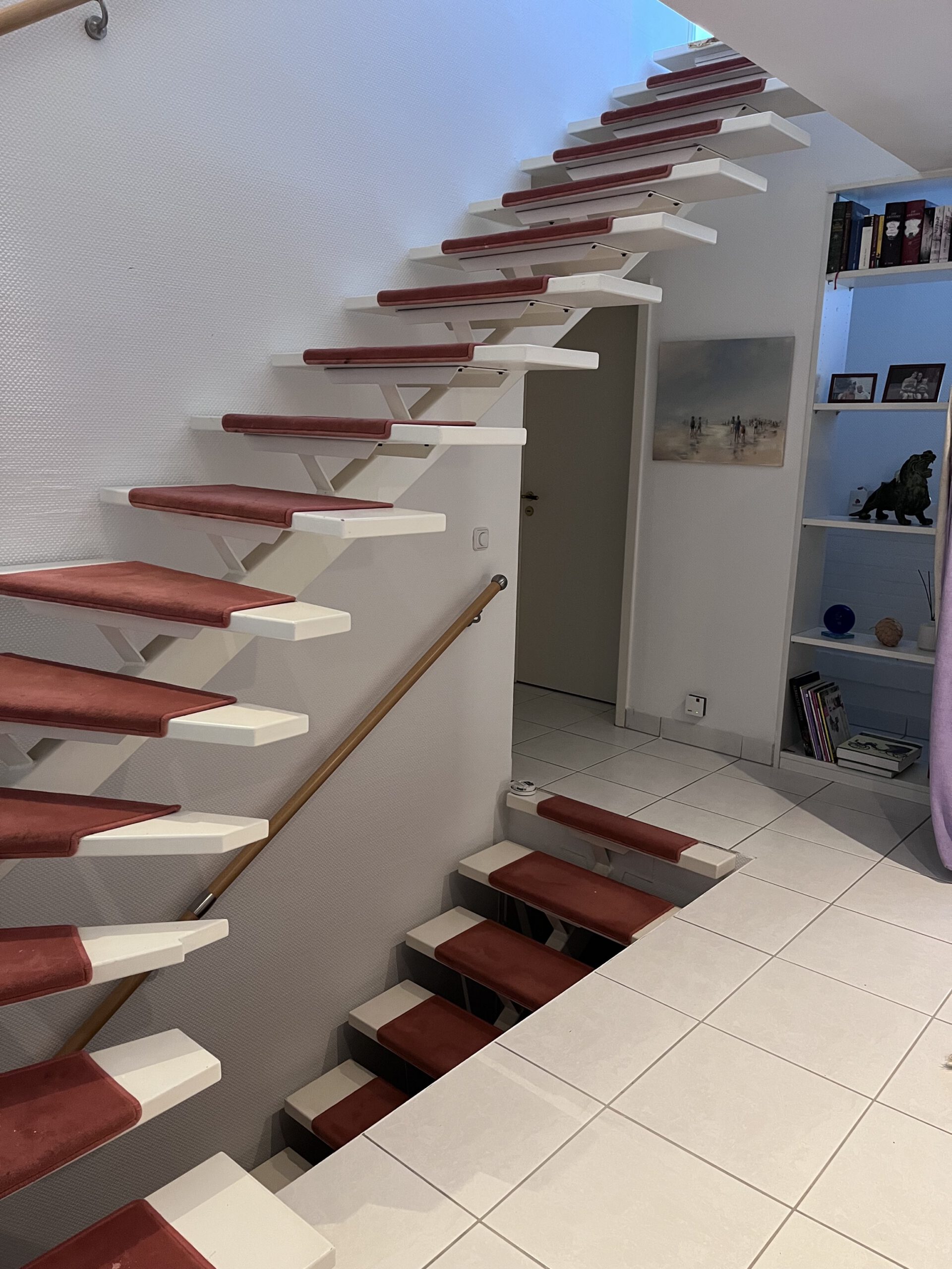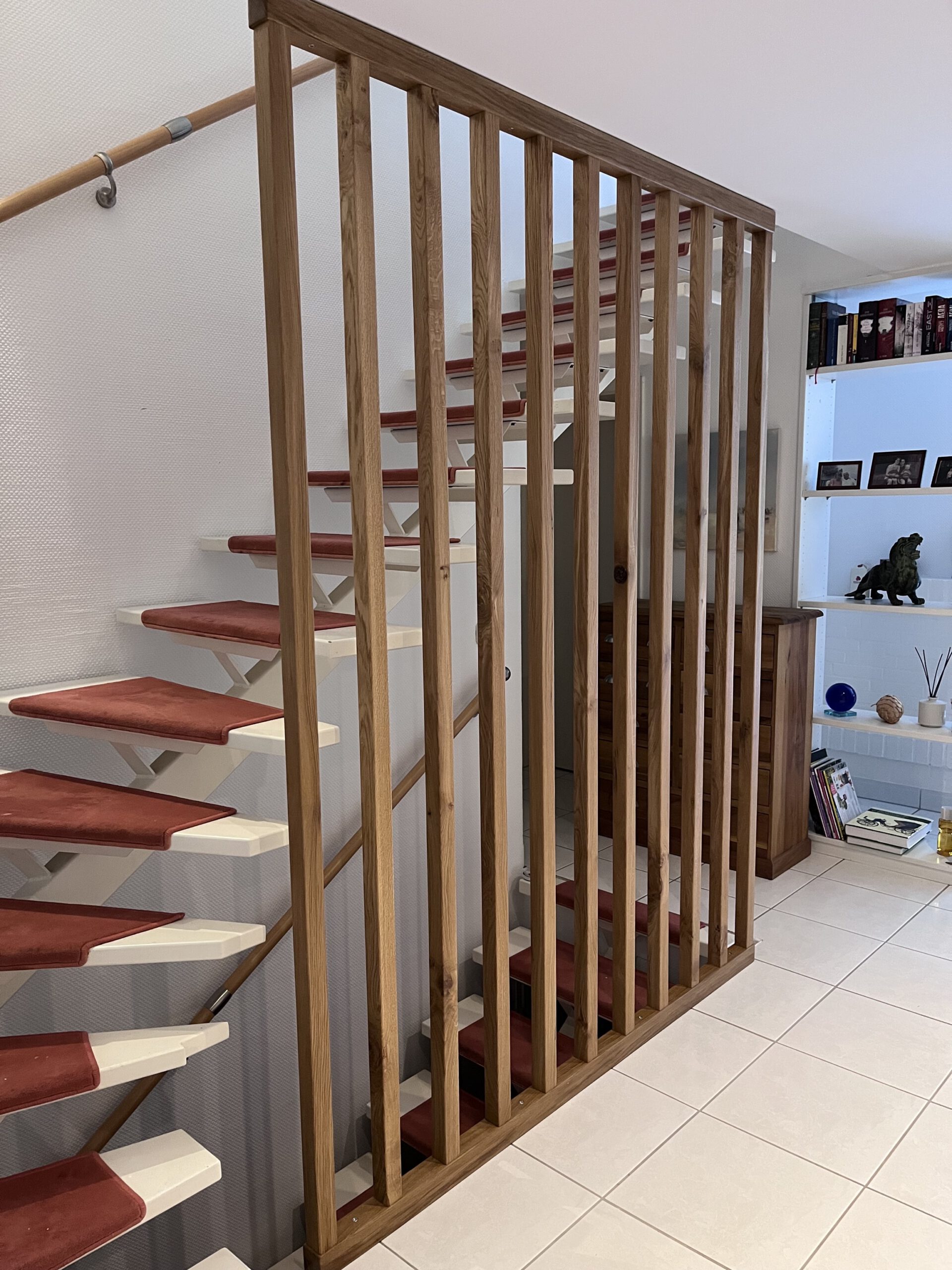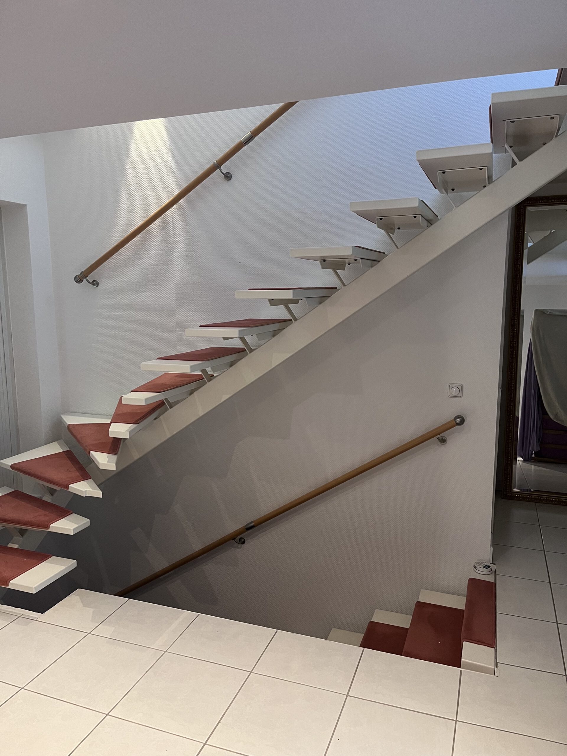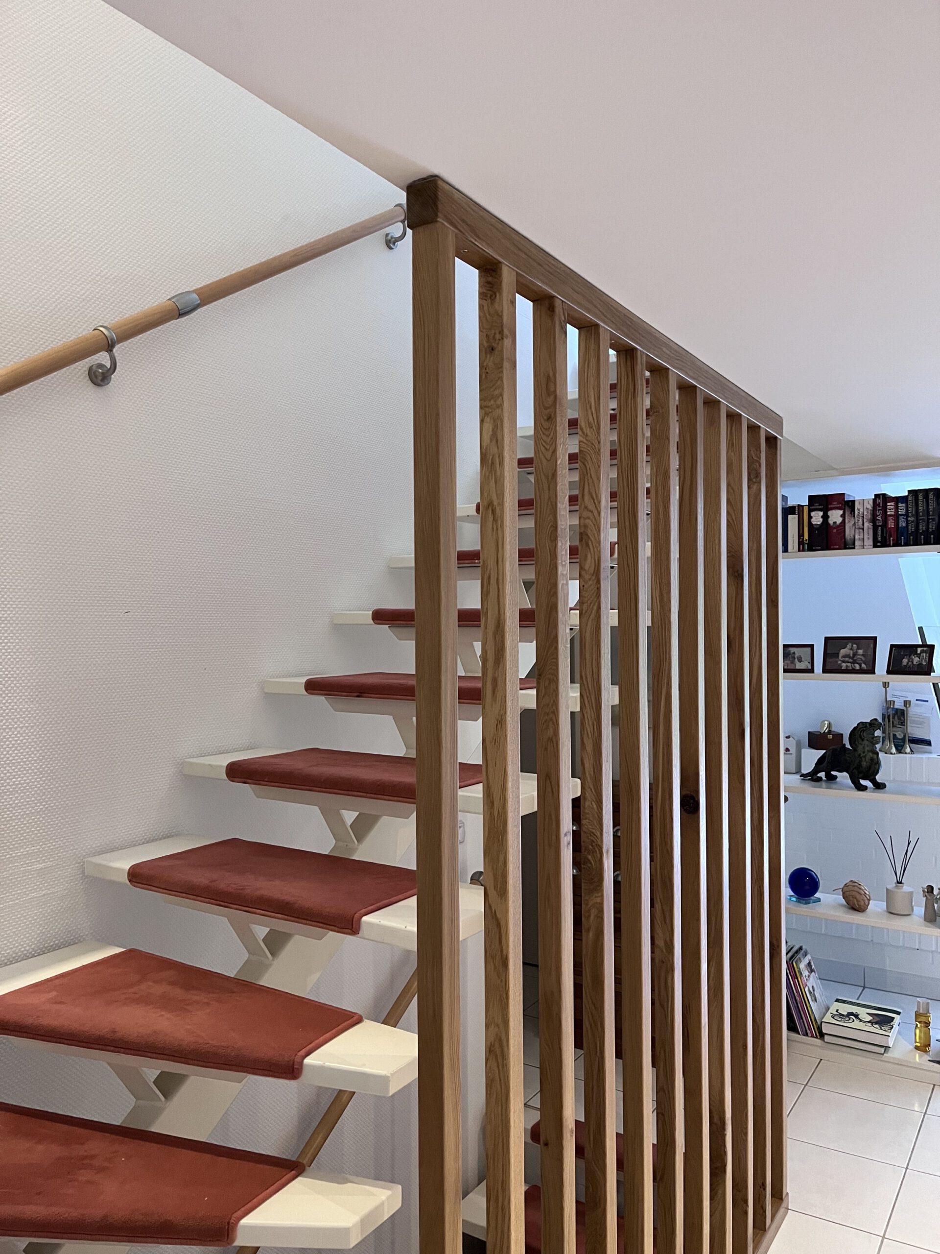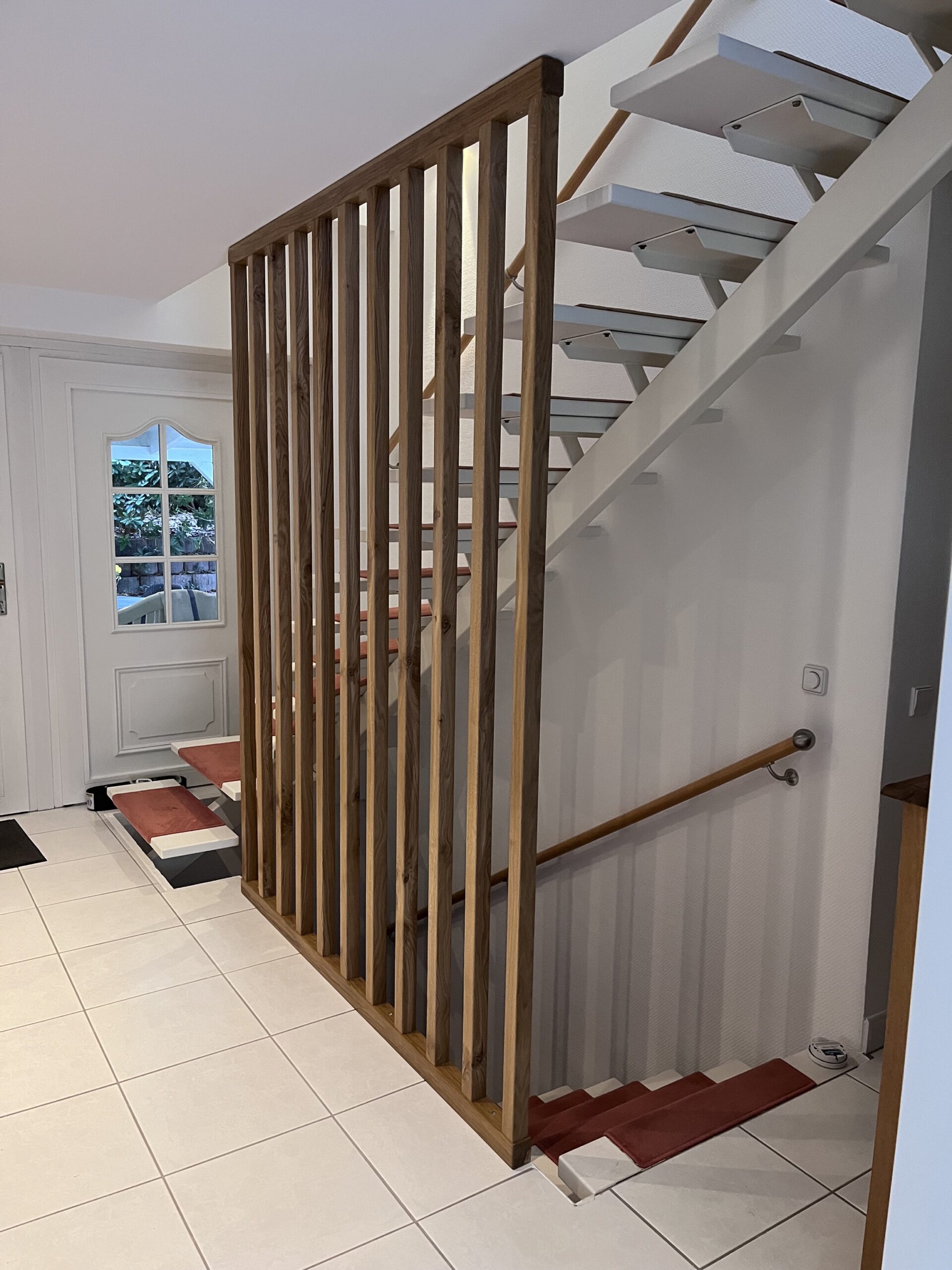 Jetzt sitzt das Geländer fest vor der Außenseite der Treppe, passt optisch perfekt zum Flur – und erfüllt genau den Zweck, den es soll: